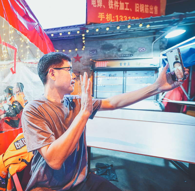 除夕夜晚,赖茂京在片刻的休息间隙,和亲人视频通话。