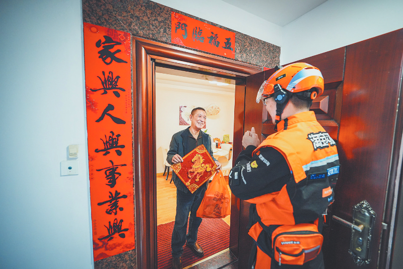 大 年 初一上午,赖茂京当天派送的第一份订单准时送达,他向客户送上了最真挚的新春祝福。