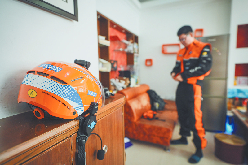 除夕清晨出门前,赖茂京正在穿戴工作服。