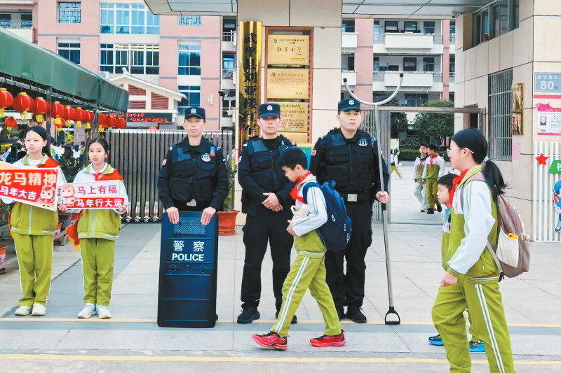 护好“第一程”,保畅学子“出行路”。“慢点走,注意安全!”一句句叮嘱温暖有力,民辅警指挥交通、引导分流,守护校园周边通行顺畅,他们帮助出门匆忙的孩子背好书包、系好红领巾,让同学们的“上学路”每一步都走得踏实又安心。