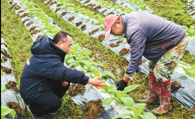 图为农技站人员与村民一起查看烟叶长势。