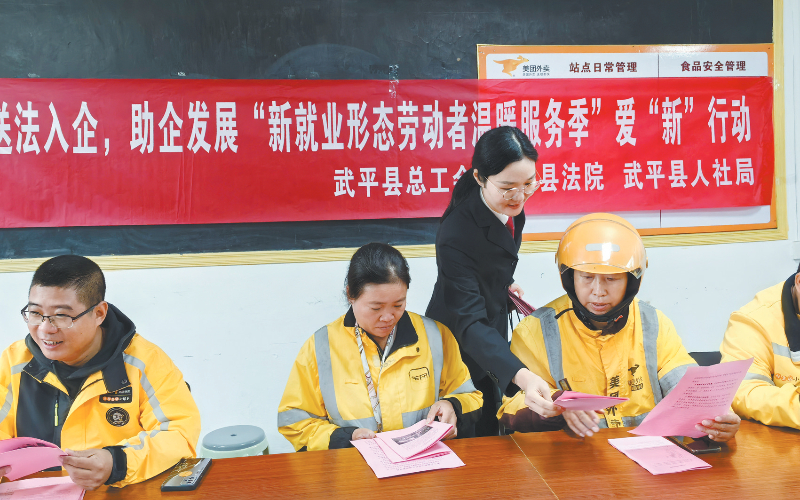 武平法院干警送法入企,帮助新就业的劳动者了解法律知识。