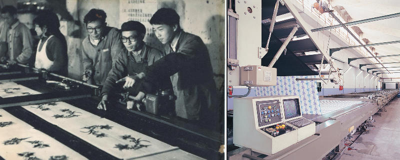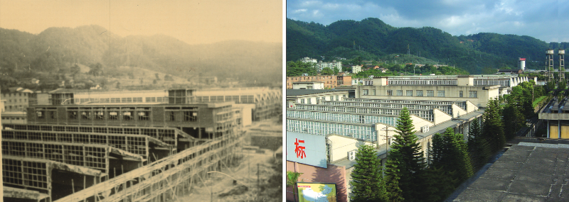 旧图为龙岩染织厂实施大整理等技改时的情景,新图为目前佳丽斯公司现代化的生产厂房和车间。