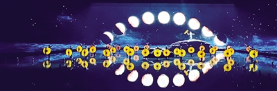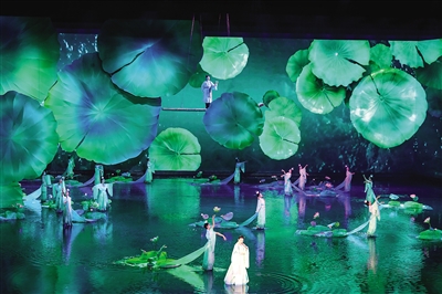 这是一出别具沉浸感的演出,在《月映武夷》可以沉浸式体验“黑科技”集群。“我们特意增强了沉浸感的设计。”冯岩说,“在结构和空间上,采用留黑形式控制多媒体节奏,避免视觉疲劳;通过月相、影像与水反光结合等方式,将抽象概念具象化;在270度全景式舞台设计中,克服三面屏技术难点,利用裸眼3D和空间模拟减小视觉差,兼顾不同角度观众的观看感受。”