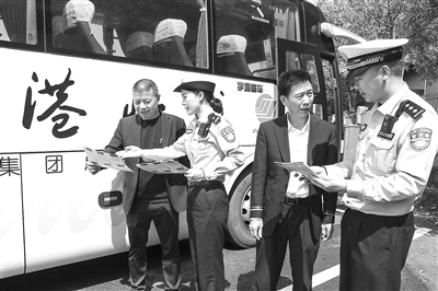 28日,南平高速交警支队五大队民警、武夷山市公安局交警大队民警、武夷山市交通运输综合执法大队执法人员、福建高速公路集团有限公司南平管理分公司武夷山管理中心工作人员等对车辆进行安全检查,确保“五一”假期群众出行安全。图为执法人员向驾乘人员讲解相关法律法规。 (邱汝泉 摄)