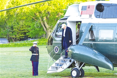 4月27日,在美国首都华盛顿,美国总统特朗普走下直升机。 美国媒体27日发布的一项联合民调结果显示,在美国总统特朗普第二任期将满百天之际,其执政支持率创下过去80年来美国历任总统同期最低纪录。 (新华社记者 胡友松 摄)