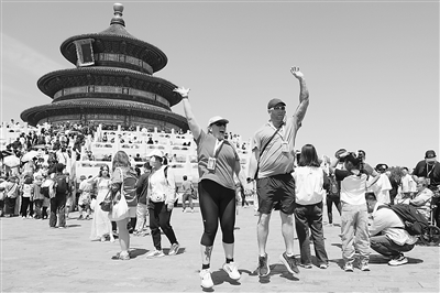 5月1日,来自澳大利亚的游客在北京天坛公园祈年殿前留影。 随着中国持续优化免签政策,推出“即买即退”、便捷化支付等便利措施,越来越多的外国游客来华旅游,“China Travel”热度持续提升。 (新华社记者 鞠焕宗 摄)