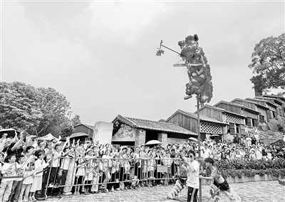 5月2日,在广东省佛山市禅城区南风古灶旅游休闲街区,游客在观看醒狮表演。 “五一”假期期间,各地推出丰富多彩的旅游产品供给,加强文旅融合和科技赋能,提升管理水平和服务品质,带动旅游消费欣欣向荣。 (新华社发 黄继明 摄)