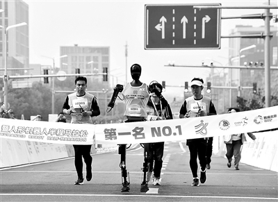 2025年4月19日,在北京亦庄举行的2025北京亦庄半程马拉松暨人形机器人半程马拉松比赛上,天工队选手天工Ultra(左二)冲向终点。(新华社记者 李欣 摄)