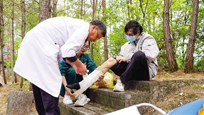 随着一声令下,演练正式打响。在创伤救治环节,演练场景为一名“游客”在景区内从3米高处坠落,致下肢骨折。医疗保障组接报后,迅速携急救设备奔赴现场。医护人员抵达后,立即评估患者生命体征,判断为下肢骨折,随即用夹板固定骨折部位,并启动创伤绿色通道,通知医院骨科、影像科、手术室等科室做好准备,随后将患者转运。