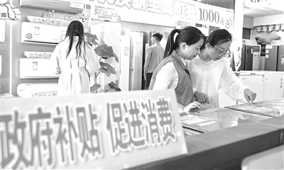 5月2日,顾客在江苏省海安市墩头镇一家商场选购补贴家电。 2025年“五一”假期,全国消费市场繁荣活跃。据商务部商务大数据监测,假期全国重点零售和餐饮企业销售额同比增长6.3%。其中,以旧换新备受欢迎,服务消费持续升温。(新华社发 周强 摄)