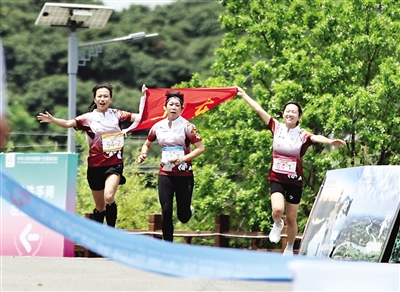 5月8日,广东队选手郑嘉怡(中)、叶琦(左)、陈淑娜在女子定向接力赛中冲向终点。 (新华社记者 黄国保 摄)