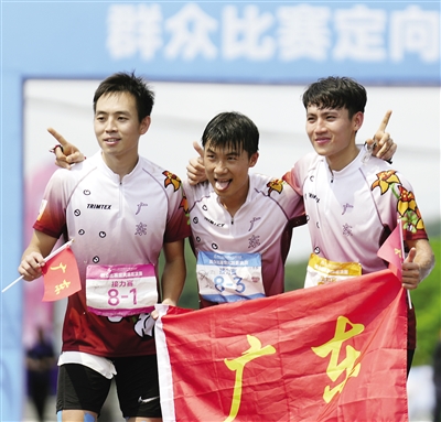 5月8日,广东队选手李卓业(中)、唐建达(左)、唐潇在男子定向接力赛夺冠后庆祝。 (新华社记者 黄国保 摄)