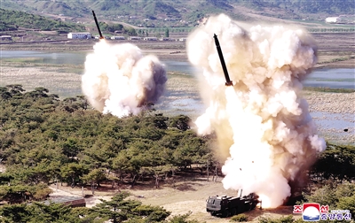 据朝中社5月9日报道,朝鲜东部远程炮兵及导弹兵部队8日进行了联合打击训练,朝鲜劳动党总书记、国务委员长金正恩指导训练。 据报道,此次训练动用600毫米多管火箭炮和“火星炮-11甲”型战术弹道导弹。这是朝中社发布的朝鲜东部远程炮兵及导弹兵部队联合打击训练的画面。 (新华社/朝中社)