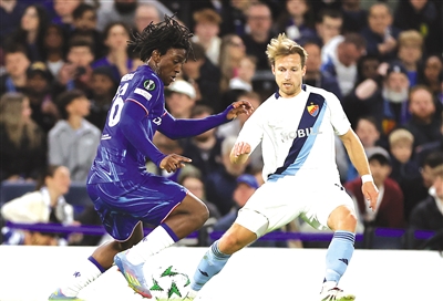 ?5月8日,切尔西队球员穆赫卡(左)与尤尔加登队球员斯滕森拼抢。