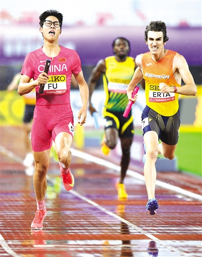 5月10日,中国队第四棒付浩然(左)在比赛中冲线。 当日,在广州天河体育中心举行的2025年世界田联接力赛男子4x400米接力预赛中,由梁宝棠、李懿卿、张起宁和付浩然组成的中国队以3分01秒87的成绩位列小组第二晋级决赛,获得东京田径世锦赛参赛资格,并打破全国纪录。 (新华社记者 邓华 摄)
