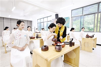 5月8日,武夷山旅游职业中专学校的茶艺老师在课堂教授茶艺。近年来,福建省武夷山市依托当地茶产业优势,持续推进茶文化、茶技能教育走进校园,在当地职业学校重点开设了茶艺、茶叶加工、茶营销等专业,为当地茶产业发展、茶文化传播培养职业技能人才。(新华社记者 姜克红 摄)