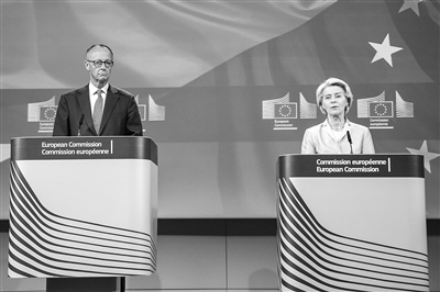 5月9日,在比利时布鲁塞尔,德国总理默茨(左)与欧盟委员会主席冯德莱恩一同出席新闻发布会。 当日, 德国总理默茨抵达比利时布鲁塞尔进行访问。 (新华社记者 彭子洋 摄)