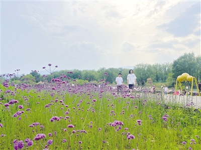 走进公园,马鞭草花田便以铺天盖地的紫色浪潮扑面而来,紫色的花穗如繁星点点,连片成海,江畔微风吹拂,马鞭草随风摇曳,掀起层层叠叠的波浪。游客穿行其间,恍若闯入莫奈笔下的油画世界。