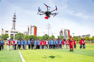 5月12日,在江苏省扬州市江都区第二中学,扬州市江都区消防救援大队消防员给学生演示消防职业技能。 5月12日是第17个全国防灾减灾日,各地展开学习应对灾难知识活动。 (新华社 任飞 摄)