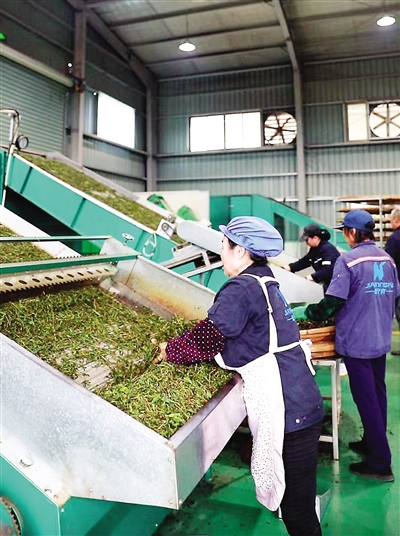 14日,位于建瓯市小桥镇霞抱村的北苑贡茶加工园区,建宁府茶叶有限公司的茶工们在加工刚采下的茶青。公司相关负责人介绍,春茶初制已经进入尾声,下一步将进入精制环节。