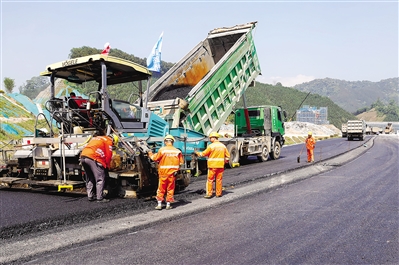 初压、复压、终压……15日,在沙南高速南平段B2标段,施工人员在铺设沥青。沙南高速公路是福建省重点建设工程。项目建成后,沙县至武夷新区的通行时间将缩短至1.5小时以内。 (朱城诚 罗光耀 摄)