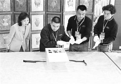 5时06分,文物抵达要客区,安放在铺有软垫的桌子上。海关人员查验完报关单后,工作人员小心翼翼开启了装有月名图的包装箱封条。