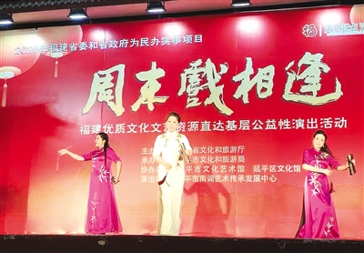 本报讯(南文 文/摄)近日,南平市“周末戏相逢”公益惠民演出活动在延开演。本次活动以国家级非物质文化遗产南平南词为亮点,融合歌舞、戏曲等艺术形式,为市民呈现了一场充满闽北风情的文化盛宴。