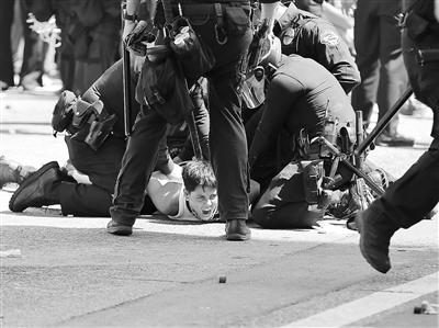 一名抗议者被警察控制。 (新华社发 邱晨 摄)