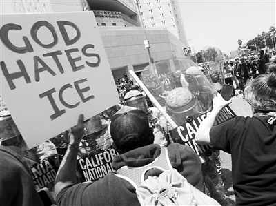 6月8日,在美国加利福尼亚州洛杉矶市中心的联邦执法机构门前,抗议者与国民警卫队人员对峙。 当地时间8日中午,在美国加利福尼亚州洛杉矶市中心联邦执法机构门前的抗议者与部署在该地的国民警卫队人员发生冲突。 (新华社发 邱晨 摄)