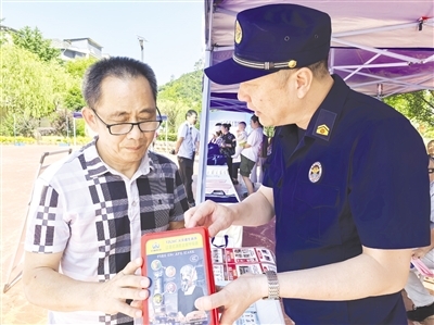6月6日,政和县消防救援大队组织开展消防宣传进社区活动,图为宣传人员讲授逃生面罩识别、使用方法。 (邵康有 摄)