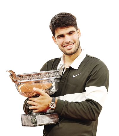 6月8日,阿尔卡拉斯在颁奖仪式上。 当日,在巴黎进行的2025法国网球公开赛男单决赛中,西班牙选手阿尔卡拉斯3比2战胜意大利选手辛纳,夺得冠军。 (新华社记者 李京 摄)