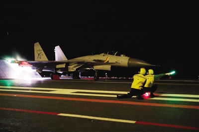 舰载战斗机进行夜间起飞 (新华社发 王健 摄)