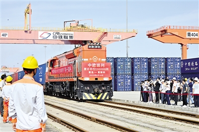 6月10日,由青岛开往莫斯科的75052次中欧班列从青岛胶州站开出。当日,随着由青岛开往莫斯科的75052次中欧班列从青岛胶州站开出,中欧班列累计开行突破11万列,货值超4500亿美元。 (新华社记者 尹栋逊 摄)