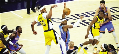 6月11日,步行者队球员迈尔斯·特纳(左三)与雷霆队球员谢伊·吉尔杰斯-亚历山大在比赛中拼抢。