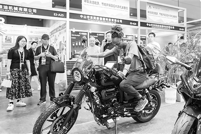 6月13日,在长沙国际会展中心,外国观众在试驾一辆中国国产摩托车。