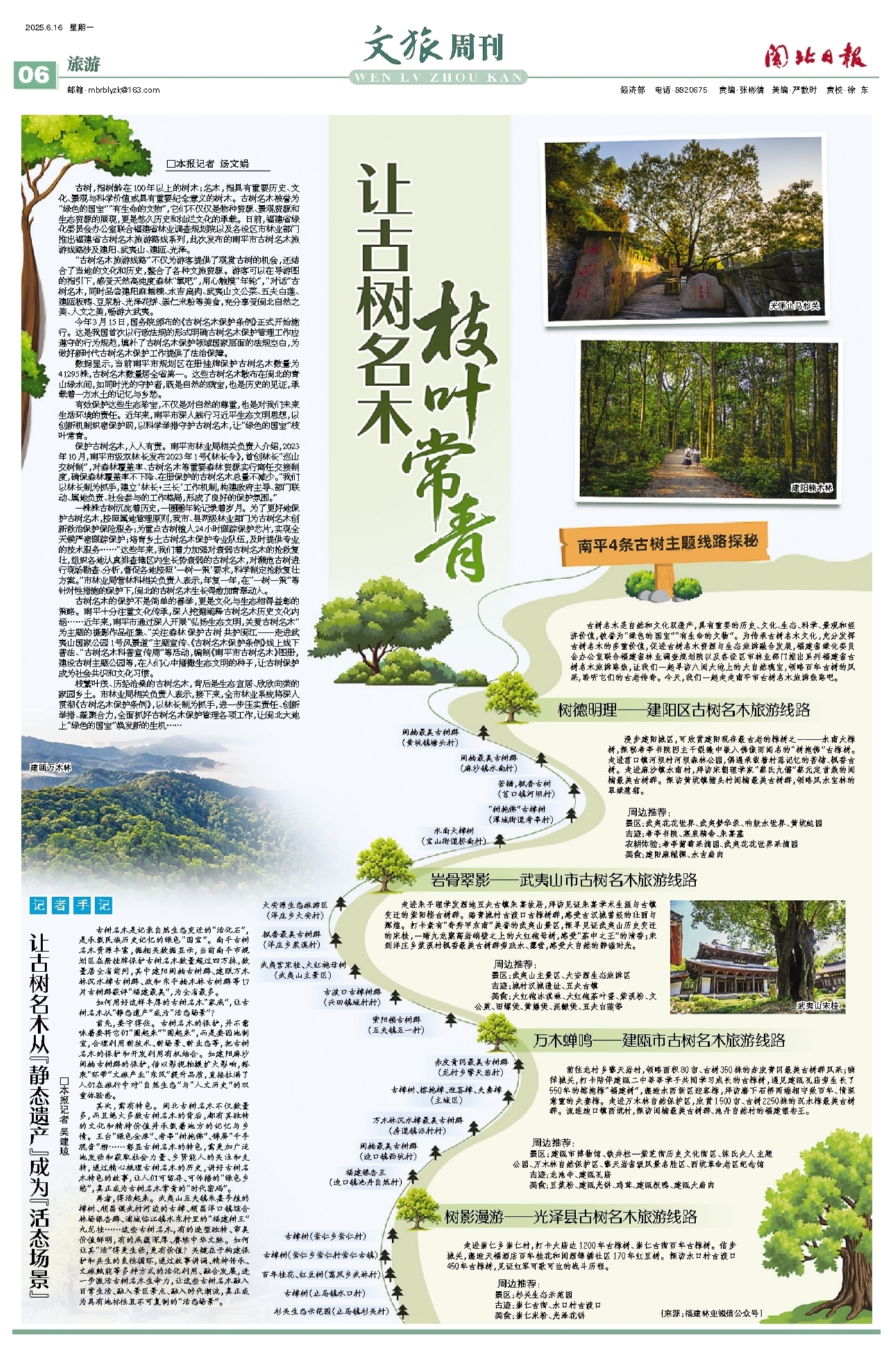 数据显示,当前南平市规划区在册挂牌保护古树名木数量为41295株,古树名木数量居全省第一。这些古树名木散布在闽北的青山绿水间,如同时光的守护者,既是自然的瑰宝,也是历史的见证,承载着一方水土的记忆与乡愁。
