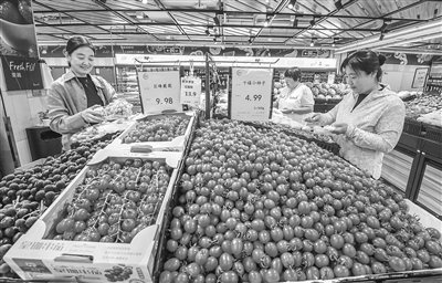 6月9日,顾客在河北省遵化市一家超市选购蔬果。 国家统计局6月9日发布数据显示,5月份,全国居民消费价格指数(CPI)同比下降0.1%,降幅与上月相同;扣除食品和能源价格的核心CPI同比上涨0.6%,涨幅比上月扩大0.1个百分点。 (新华社发 刘满仓 摄)