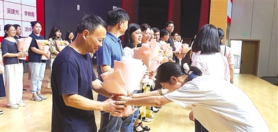 随后,11位学生代表向老师和家长代表献上鲜花,43捧鲜花,朵朵饱含灿烂的深情重义,也代表着孩子们“一举夺葵”的愿望。典礼上,学校还为60位获得优秀毕业生荣誉的同学颁发奖杯、奖状。张曙光校长颁发了毕业证书,并与每一位毕业生握手并送上祝福。