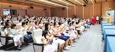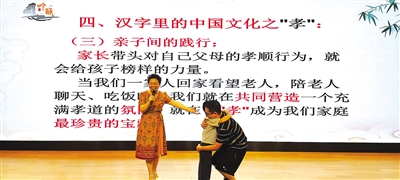 叶启春先是通过“亲子默契大考验”、手脑互动小游戏等互动环节活跃现场氛围,以亲子间的温馨互动引发全场共鸣。随后,她讲解了“读”和“孝”两个汉字中所蕴含的中华传统文化——将“读”字解析为“言”与“卖”的智慧组合,以历史中的传承和亲子阅读的力量,诠释“读,是打开世界的文化钥匙”;从甲骨文“孝”字的“子承老形”意象,到卧冰求鲤、亲尝汤药等许多关于孝的感人故事,诠释“孝,是传承千年的温情密码”,引导家长和孩子养成阅读的良好习惯,在阅读中增进亲子关系,在言传身教中传递中华孝文化。现场,叶启春还邀请家长和孩子分享家庭阅读故事和孝敬长辈的家庭故事,引来台下阵阵掌声。“听了这堂课,我学到了很多汉字的知识,了解到了‘读’和‘孝’两个字的深层含义。”小学二年级学生王怡然说,自己很喜欢一开场的互动小游戏,站在台上和台下的小朋友们一起做“手指操”,一起玩耍,她感觉很快乐。
