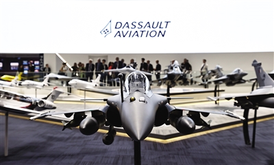 6月17日,在法国巴黎近郊布尔歇机场举行的第55届巴黎航展上,人们参观达索公司展区。