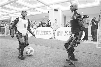 在北京市机器人产业园(亦庄)的“机器人大世界”前,“活力中国调研行”记者团最新观看了一场趣味足球赛,比赛双方是来自北京加速进化公司的人形机器人。正是这款机器人,让中国团队在今年3月的RoboCup机器人世界杯德国公开赛上夺得冠军。
