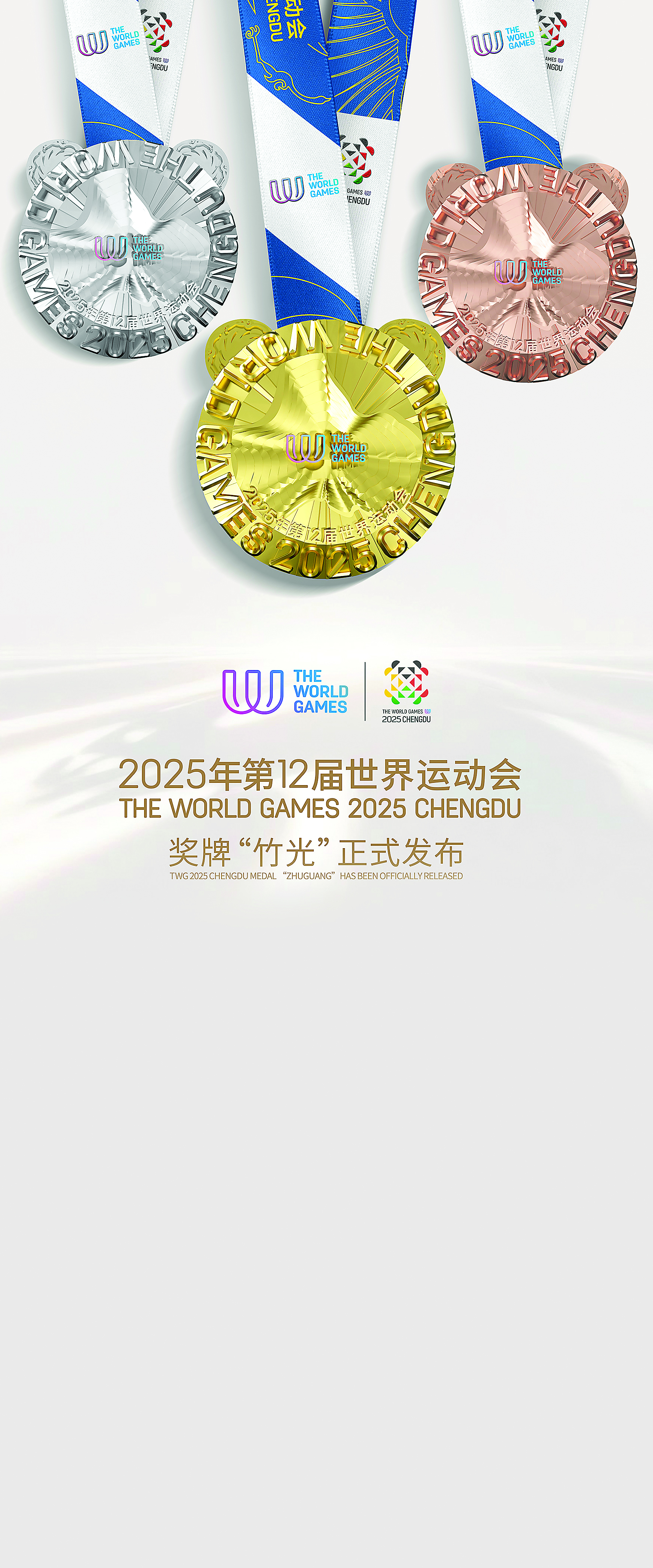 “竹光”奖牌正面居中的是国际世界运动会协会会徽,赛事中英文名称环绕呼应。巧妙融入的太阳神鸟纹饰,与暗合城市轮廓的流动凹凸线条,在底部营造出层层光芒,既彰显中华文明、巴蜀文化的璀璨历史,更象征着运动精神永恒闪耀。