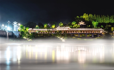 夜幕降临,临安坝公园渐次点亮温暖的灯光。崇阳溪水面化作流动的镜面,将岸边的灯火揉碎成万千金箔,晚风拂过时泛起粼粼波光。100多米长的木结构长廊被灯笼染成琥珀色,市民们三三两两倚着雕花靠椅,摇着蒲扇闲话家常,木质地板随着散步人群的脚步发出舒缓的吱呀声。