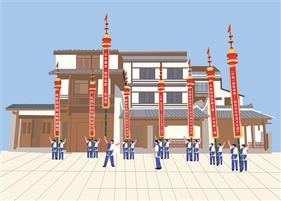 通仙门前,一批挑幡传承人每日不辞辛劳练习着技艺。建瓯挑幡,2005年成为福建省首批省级非物质文化遗产,2008年被列入第一批国家级非物质文化遗产名录。它始于明末,至今已有340多年的历史。民族英雄郑成功率领大军横渡海峡,收复台湾凯旋之时,百姓连日备宴庆贺,将士们则将带回的军旗捆在长竹竿头,尽情挥舞,以表示对壮烈捐躯的弟兄们的怀念之情。此后每年均以此礼节告慰英烈,世代传承,并演变成当今建瓯民间特有的挑幡习俗。