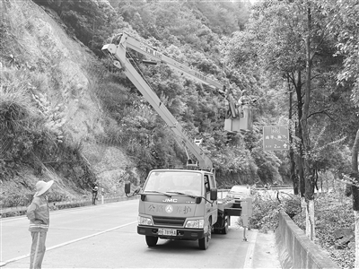 为加强路域环境治理,保障公路安全畅通,连日来,松溪公路事业发展分中心开展“清枝亮牌、疏枝透景”专项整治行动,组织养护工对公路沿线遮挡标志牌和侵入行车空间的树枝进行修剪。图为修剪现场。 (张良 摄)