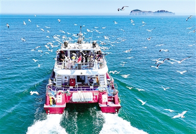 6月23日,在山东省荣成市海驴岛海域,游客们乘船体验,并与黑尾鸥互动(无人机照片)。连日来,多地持续高温,众多市民和游客亲水游玩,乐享清凉。 (新华社发 李信君 摄)
