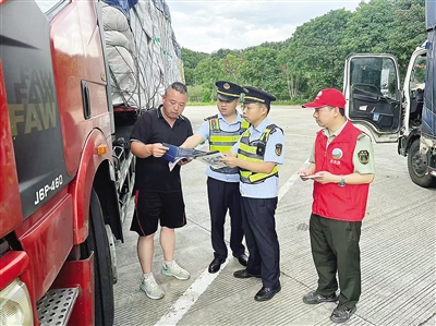 为进一步提升公众安全意识与应急能力,近日,南平高速执法支队联合高速交警、南平高速公司等部门开展“安全宣传咨询日”活动,宣传、解读《道路运输条例》《福建省治理公路货物运输车辆超限超载条例》等法规条款。图为18日南平高速执法支队五大队与松溪管理中心、湛卢服务区管理人员在服务区向货车司机讲解超限货车典型案例。 (邓凌君 刘迪杉 摄)