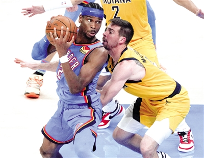 6月22日,雷霆队球员吉尔杰斯-亚历山大(左)在比赛中进攻。 当日,在2024-2025赛季NBA总决赛第七场比赛中,俄克拉荷马城雷霆队主场103比91战胜印第安纳步行者队,总比分4比3夺冠。 这是该队在2008年搬迁至俄克拉荷马城后的首冠。雷霆队的前身是西雅图超音速队,超音速队曾在1979年夺得NBA总冠军。雷霆队主将谢伊·吉尔杰斯·亚历山大荣膺总决赛MVP(最有价值球员)。总决赛期间,他场均能够得到30.3分、4.6个篮板、5.6次助攻。 (新华社发 孙宇轩 摄)