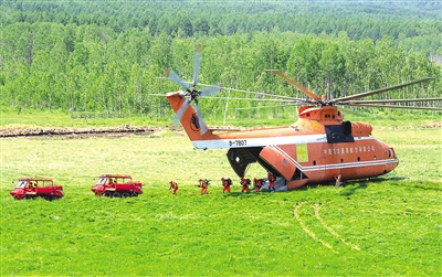 6月24日,一架直升机运载全地形运兵车和灭火队员到达黑龙江省大兴安岭地区的演习现场。